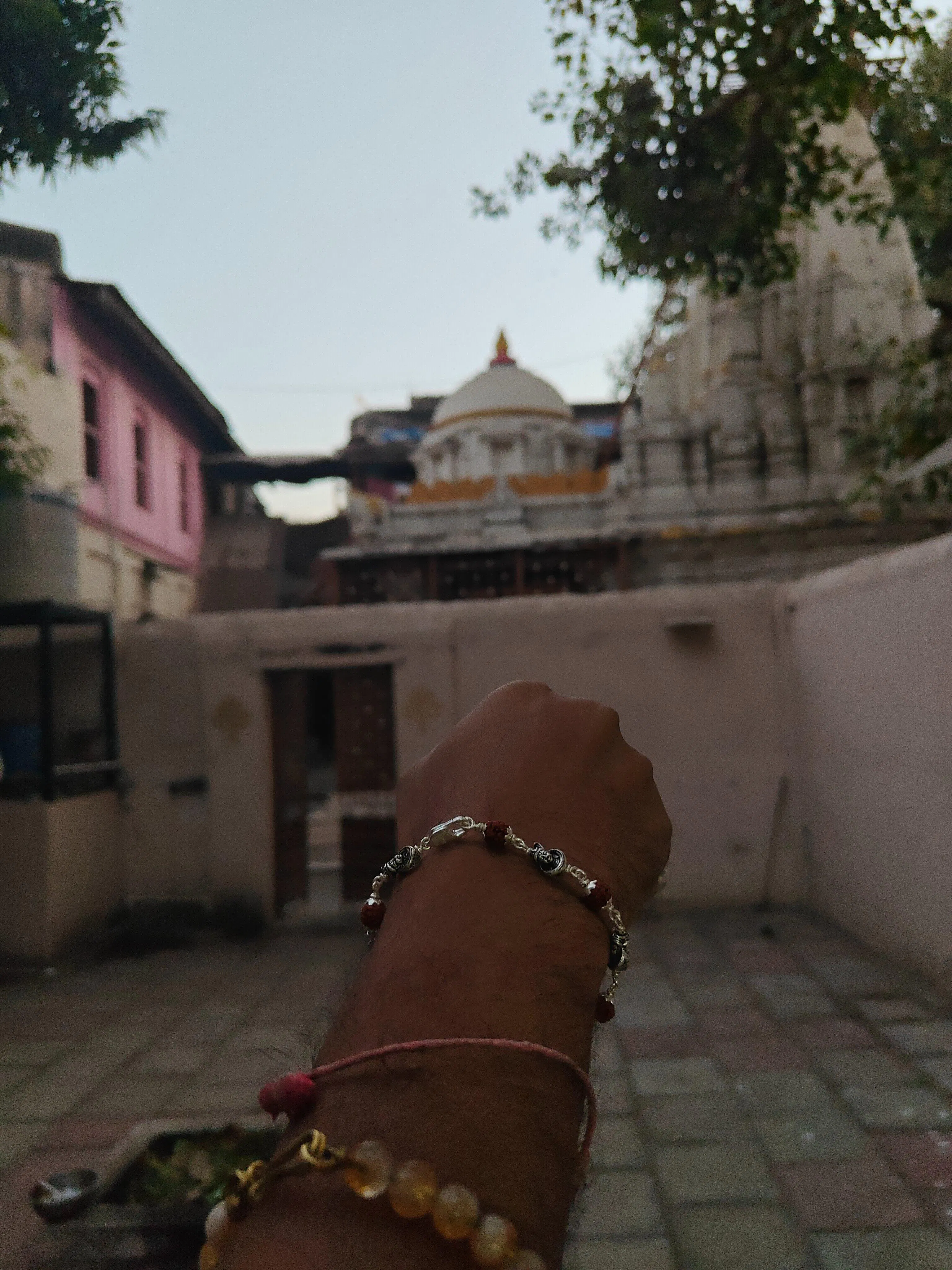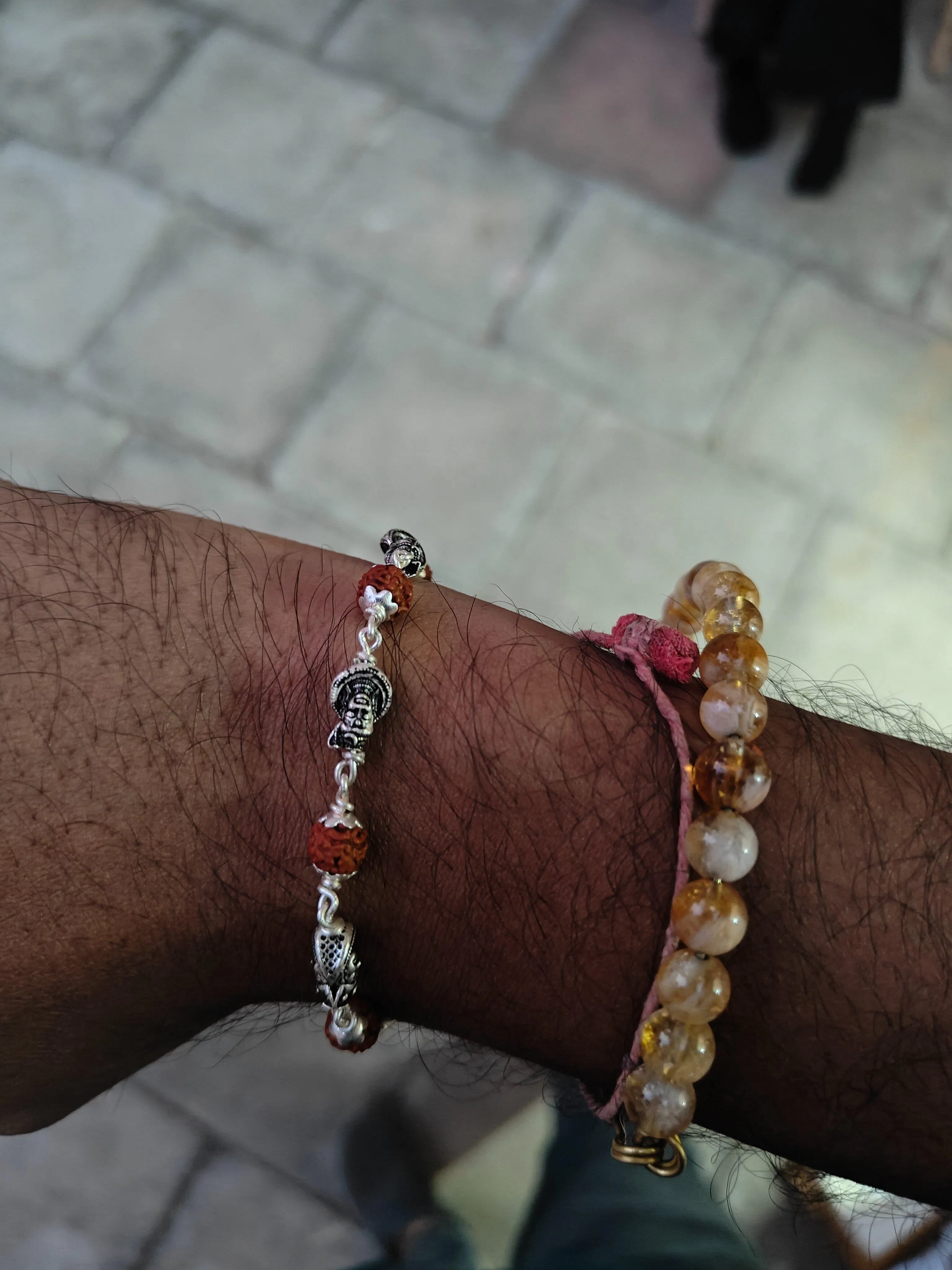 Adorned with 5 Mukhi Rudraksha beads, this bracelet radiates strength, balance, and protection. Free size and unisex, it is meant to be worn on the wrist — a daily reminder of Shiva’s grace and fearless presence.