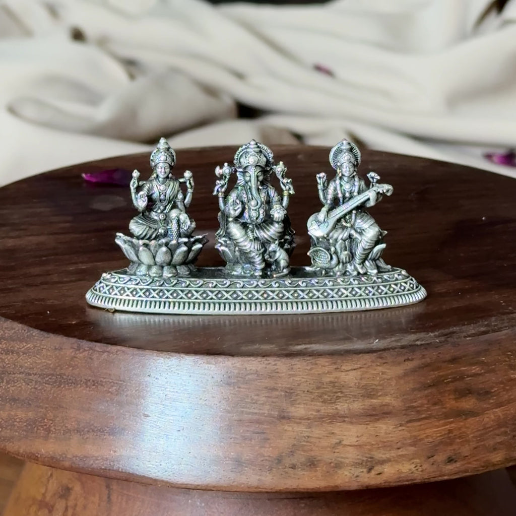 The Lakshmi Ganesha Saraswati Pure Silver Idol: Trimurti Edition is a divine creation symbolising the trinity of wisdom, prosperity, and auspicious beginnings. In TARAKESH, we have designed this edition to unite Goddess Lakshmi, Lord Ganesha, and Goddess Saraswati — embodying wealth, intellect, and harmony in perfect balance. Crafted in hallmarked 92.5 pure silver, this edition radiates sacred energy and refined elegance, making it a powerful centrepiece for homes, temples, and sacred spaces. The Trimurti Edition reflects the combined blessings of these three deities, inviting success, clarity, and abundance into every devotee’s life.