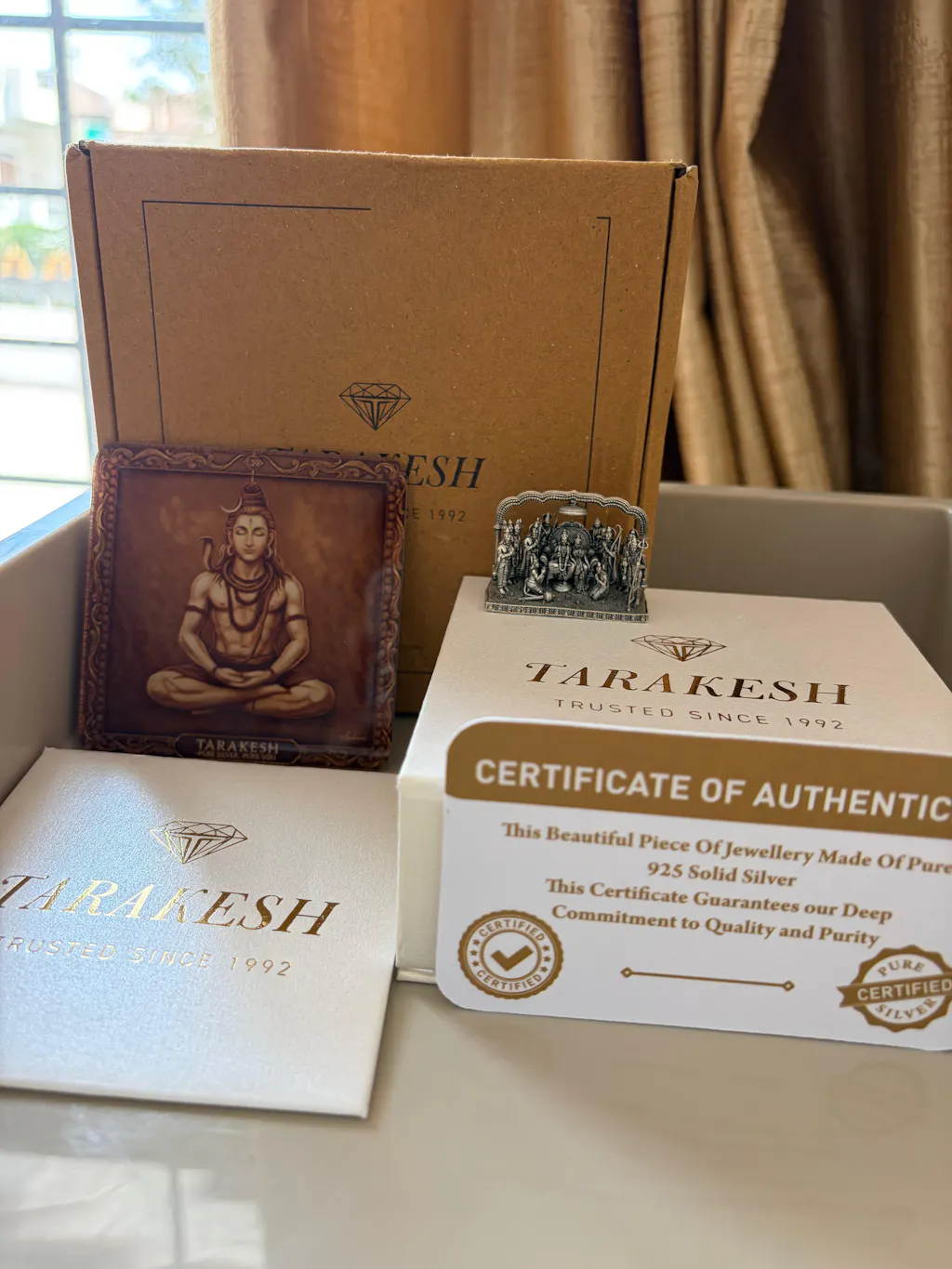 The Ram Darbar Pure Silver Idol is a divine representation of harmony, righteousness, and eternal family values, featuring Lord Ram, Sita, Lakshman, and Hanuman together in a sacred form. Crafted in pure silver with intricate artistry, this idol radiates spiritual strength and serenity. In TARAKESH, we have designed this edition to reflect the ideals of dharma and devotion embodied by Ram Darbar, making it a timeless piece for every sacred space.
