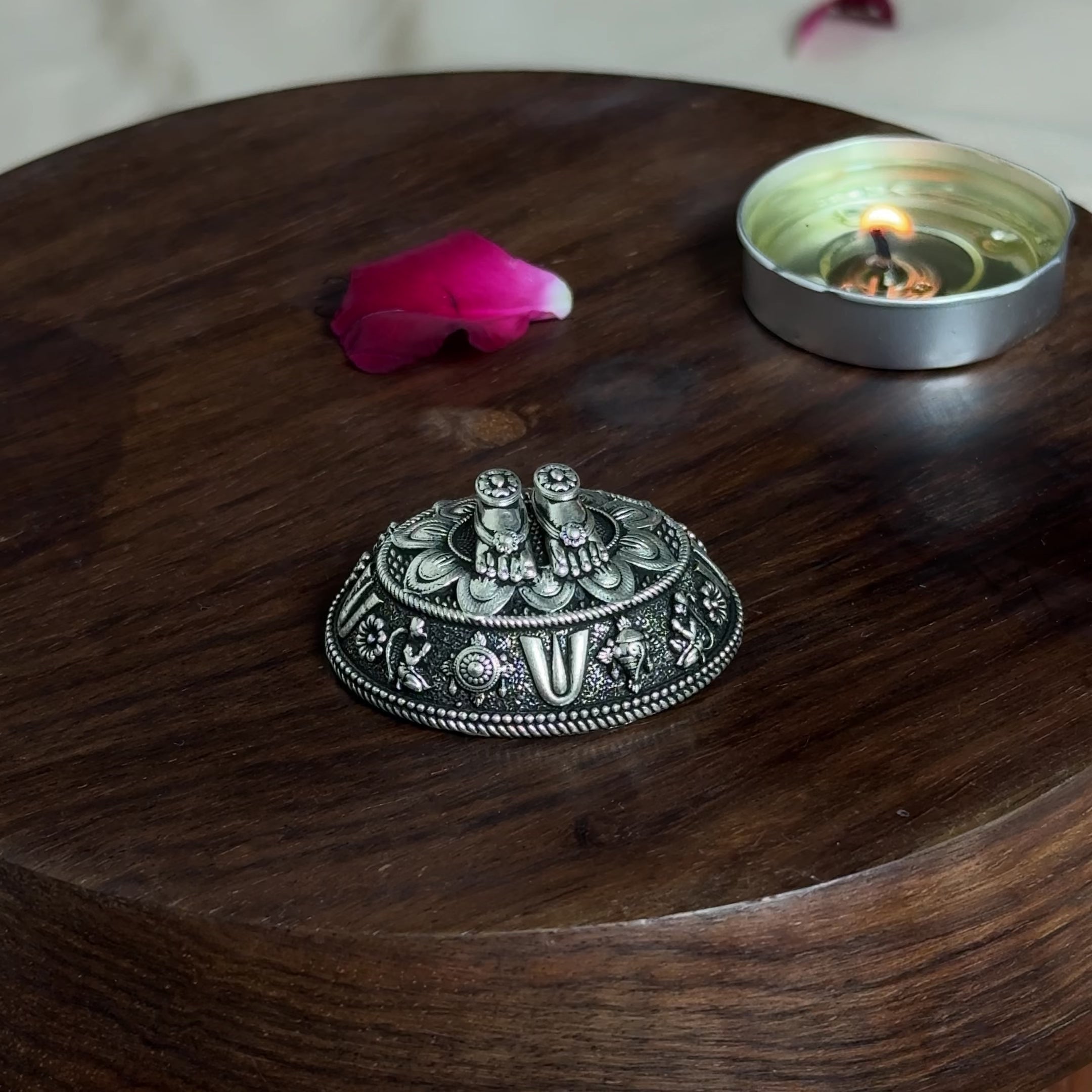 Vishnu Pure Silver Idol: Padma Charan Edition — a sacred representation of Lord Vishnu’s holy feet (Vishnupada), revered as the source of divine blessings, protection, and spiritual liberation. Worshipping Vishnu’s feet is believed to bring peace, prosperity, and moksha to devotees. At TARAKESH, we have designed this idol with deep reverence, intricately crafted in Hallmarked 92.5 Pure Silver to invite divine grace into homes, temples, and sacred spaces.